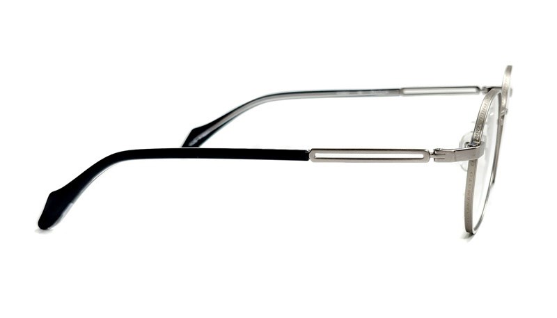 シャープな印象のヘキサゴンシェイプに、リム構造の潔さとわずかな個性を潜ませている。正面には立体ブロック体ロゴが静かに浮かび上がり、繊細な音叉モチーフのテンプルが造形に存在感を与える。